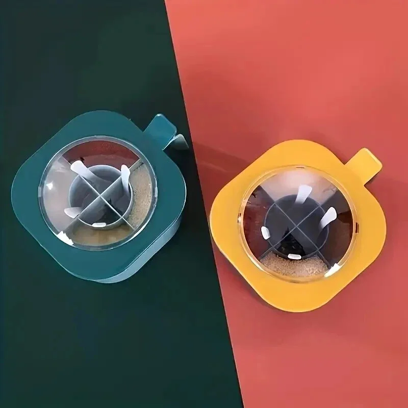 Runde 4-in-1-Gewürzbox aus Kunststoff für die Küche, rostbeständig, mit 4 Löffeln.